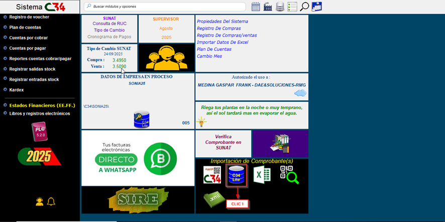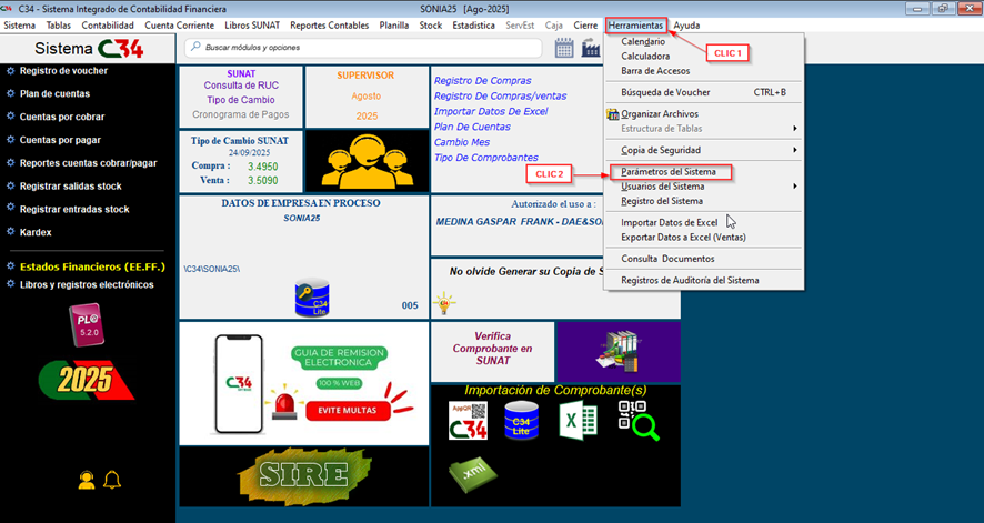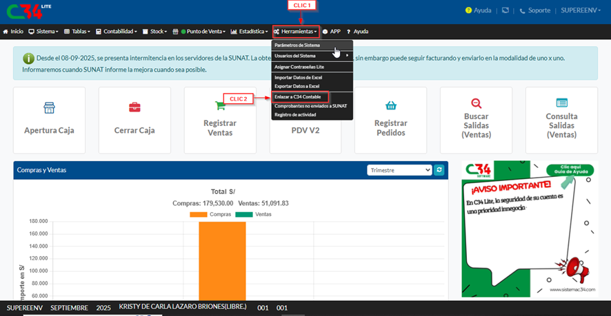Nos dirigimos al sistema c34 lite, luego CLIC (1) en Herramientas, y CLIC (2) en Enlazar C34 Contable.