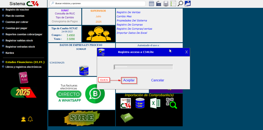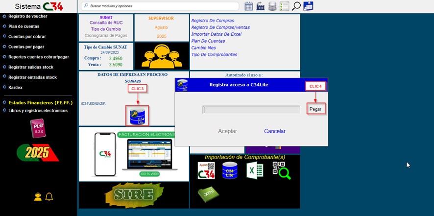 Ingresamos al sistema C34 ESCRITORIO, CLIC (3) en el Icono Azul de C34 Lite y luego CLIC (4) en Pegar.