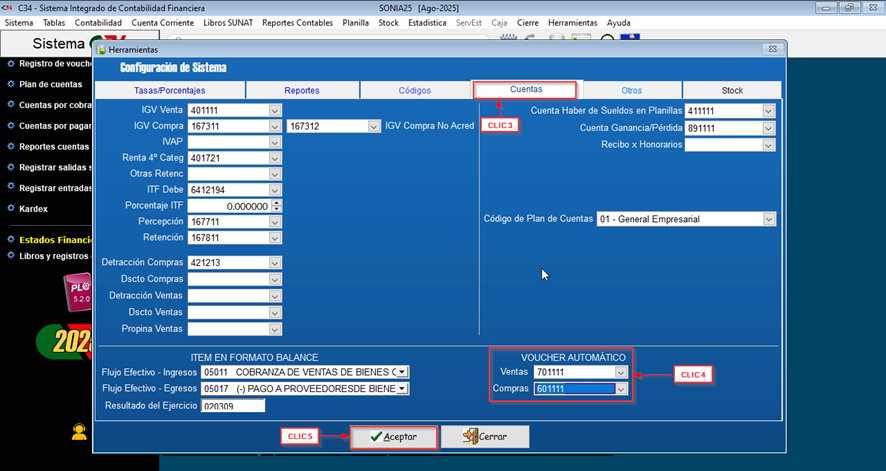Ingresamos al sistema C34 ESCRITORIO, y nos dirigimos a Herramientas CLIC (1), CLIC (2) en Parámetros Del Sistema, CLIC (3) en Cuentas, luego (CLIC 4) completar el campo de (VOUCHER AUTOMATICO) y (CLIC 5) en Aceptar para guardar los cambios.