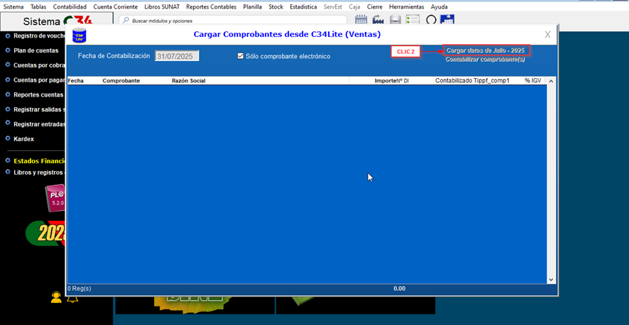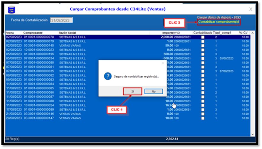 Para finalizar la importación nos dirigimos importación de comprobantes y buscamos el Icono Azul CLIC (1), tener en cuenta que tenemos que estar en el mes donde queremos que suban nuestros comprobantes tanto en el C34 Escritorio y C34 Lite, (CLIC 2) en Cargar Datos del mes que deseas importar las ventas, luego CLIC (3) en Contabilizar los Datos y por último CLIC (4) en Si[/kbd] para contabilizar los registros.