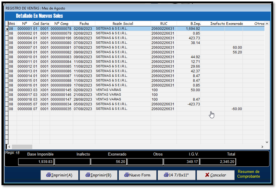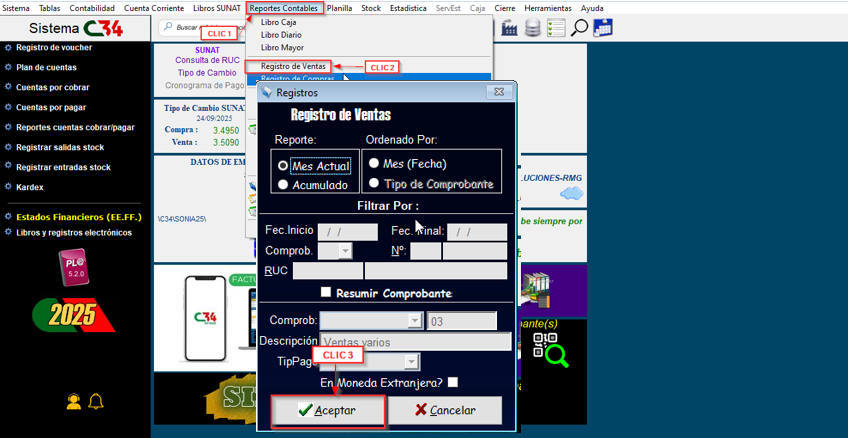 Para verificar nuestra información importada dirigirse al módulo Reportes Contables CLIC (1), CLIC (2) en Registro De Ventas y CLIC (3) en Aceptar.
