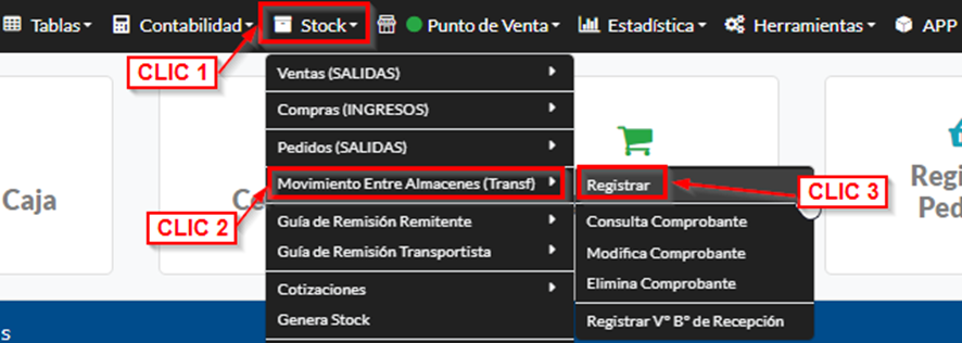 Nos dirigimos al modulo de STOCK (CLIC 1), seguidamente en Movimiento Entre Almacenes (CLIC 2), y en Registrar (CLIC 3).