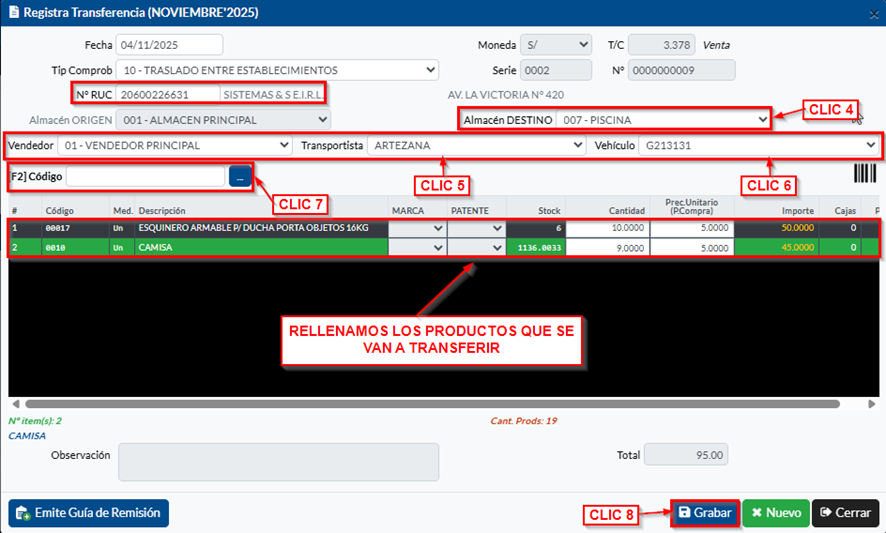 Nos saldrá una ventana donde registraremos lo requerido, en N° RUC colocamos el RUC de nuestra empresa, seguidamente el Almacén de Destino (CLIC 4), el Almacén ORIGEN estará bloqueado ya que predeterminadamente el USUARIO del sistema ya tiene asignado su ALMACEN, posteriormente rellenamos Vendedor, Transportista (CLIC 5), y en Vehículo (CLIC 6), digitamos los productos que vamos a transferir (CLIC 7), finalmente en Grabar (CLIC 8).