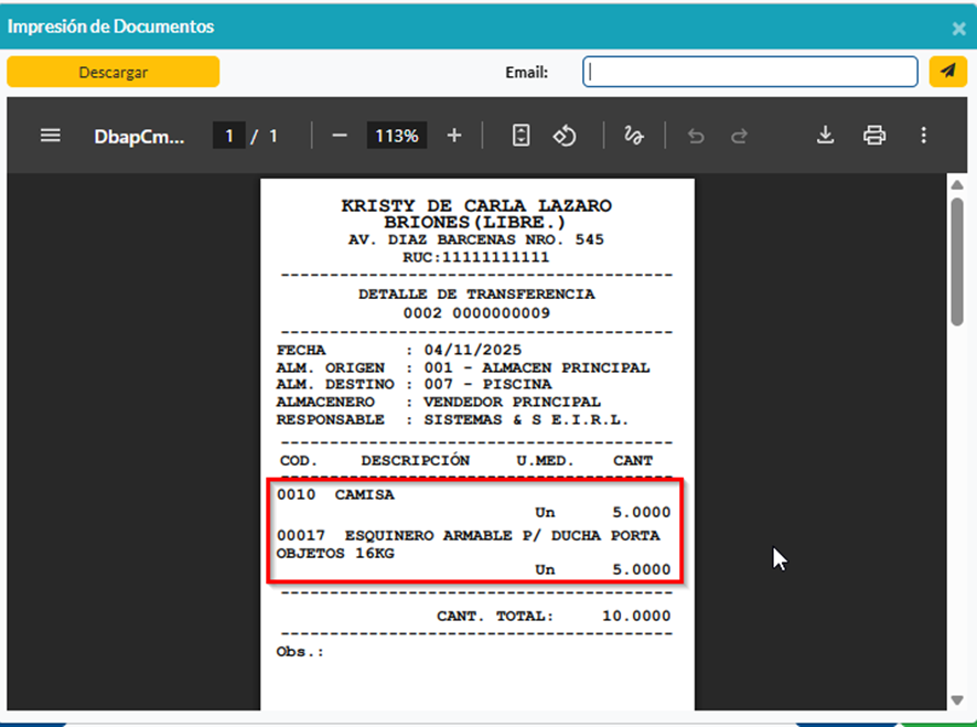 El formato lo podemos configurar para tamaño ticket y A4, donde nos figurará los detalles de los productos que fueron transferidos.