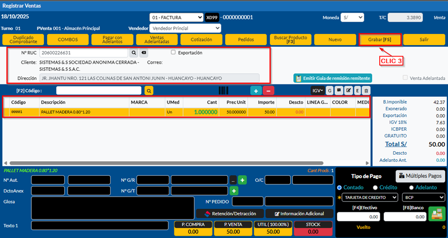 En la ventana emergente, rellenamos todos los datos del comprobante que se va emitir y le damos CLIC (3) en Grabar (F5).