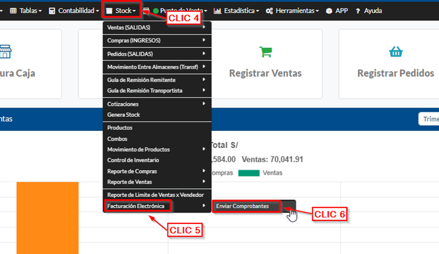A continuación, nos dirigimos al módulo Stock CLIC (4), CLIC (5) en Facturación Electrónica y CLIC (6) en Enviar Comprobante.