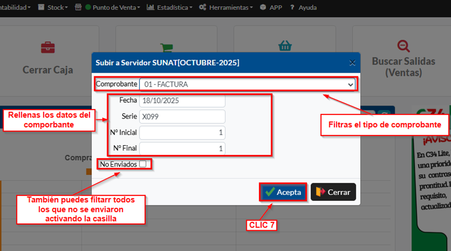 En la ventana emergente filtramos los datos, deslizamos y seleccionamos el comprobante, digitamos los datos respectivos, luego CLIC (7) en Aceptar, cabe resaltar que podemos filtrar todos los comprobantes No Enviados activando el filtro.