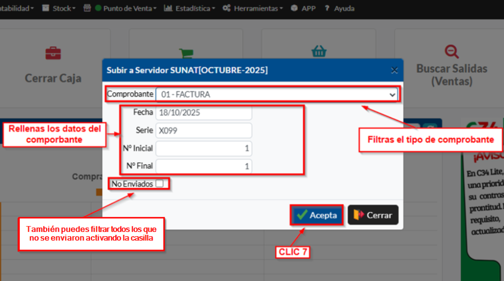 En la ventana emergente filtramos los datos, deslizamos y seleccionamos el comprobante, digitamos los datos respectivos, luego CLIC (7) en Aceptar, cabe resaltar que podemos filtrar todos los comprobantes No Enviados activando el filtro.