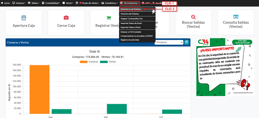 Para poder realizar la APERTURA DE CAJA CON FECHA ANTERIOR, ingresamos al Sistema y nos dirigimos al menú Herramientas (CLIC 1), luegoen Parámetros del Sistema (CLIC 2).