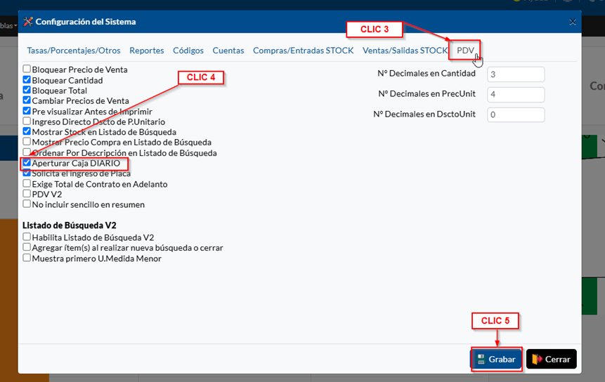 En la ventana emergente nos dirigimos al módulo PDV (CLIC 3), desactivamos la opción de APERTURAR CAJA DIARIO (CLIC 4) y grabar (CLIC 5).