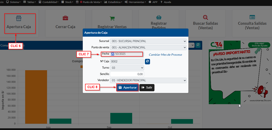 A continuación, nos dirigimos al módulo APERTURAR CAJA (CLIC 6), cambiamos la fecha en este caso al 18/10/2025 (CLIC 7), y luego le damos en Aceptar (CLIC 8).