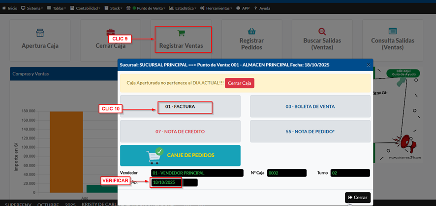Nos dirigimos al módulo REGISTRO DE VENTAS (CLIC 9), nos saldrá un mensaje de alerta “caja aperturada no pertenece al día actual”, verificamos la fecha con la cual deseamos emitir los comprobantes y le damos en Factura (CLIC 10).