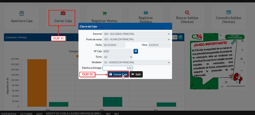 Una vez emitido todos los comprobantes, nos dirigimos al módulo de CERRAR CAJA (CLIC 11), y luego en Cerrar caja (CLIC 12).