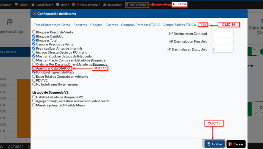 Nos dirigimos al menú herramientas (CLIC 13), parámetros del sistema y en ventana emergente nos ubicamos en el módulo PDV (CLIC 14), y activamos la opción de Aperturar caja diario(CLIC 15), finalmente le damos en grabar(CLIC 16).