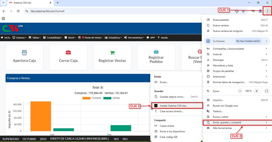 Cuando estemos en el Sistema C34 Web, nos dirigimos a la parte superior derecha y hacemos CLIC (1) en el ícono de tres puntos. Luego, deslizamos hacia abajo hasta encontrar la opción Enviar, Guardar y Compartir CLIC (2). Seguidamente, seleccionamos la opción Instalar Sistema C34 Lite CLIC (3).