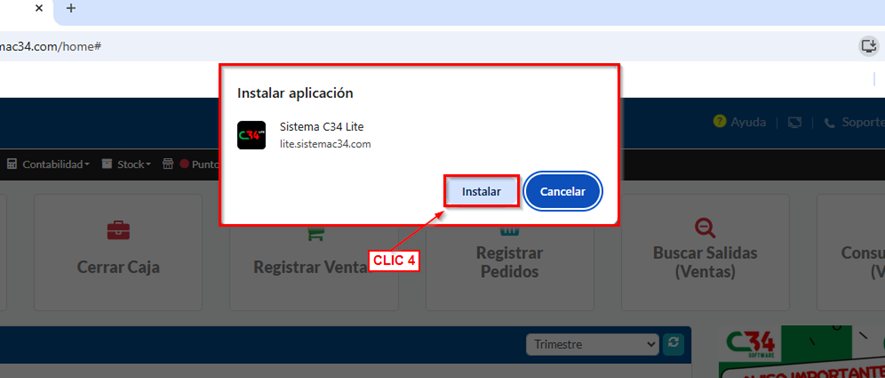 A continuación, aparecerá un cuadro con el mensaje: “Instalar C34 Lite”. El acceso directo se generará en el escritorio. En este punto debemos hacer CLIC (4) en Instalar.