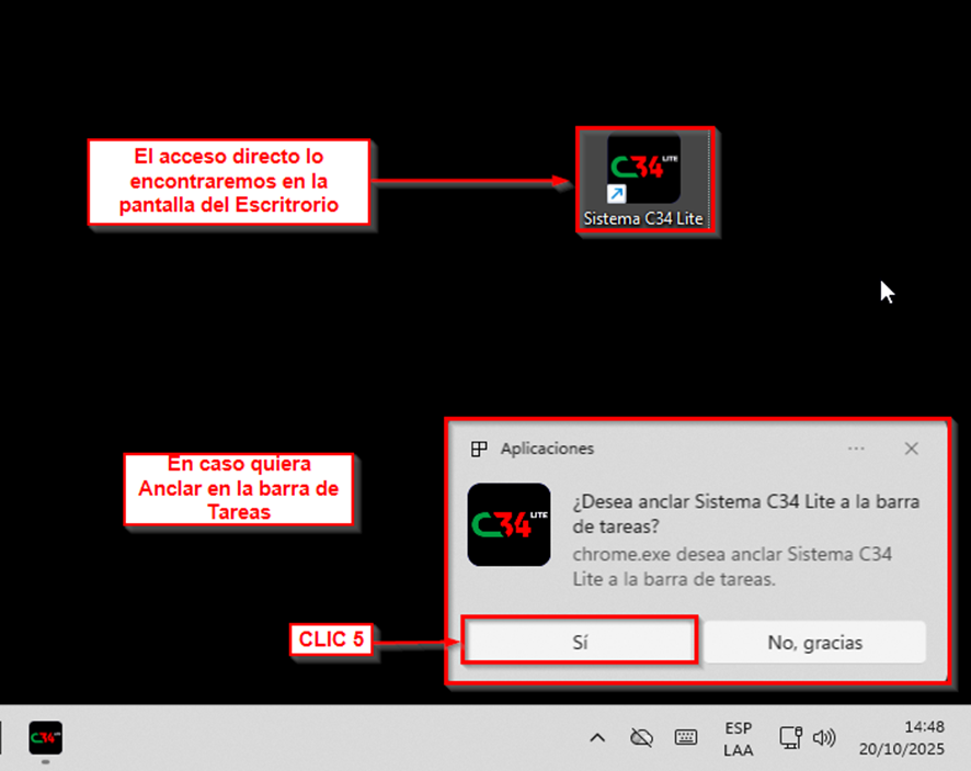 Y el acceso directo se añadirá automáticamente a la pantalla principal, permitiendo un acceso rápido y práctico al SISTEMA C34 y quedará disponible en un ícono independiente, facilitando el ingreso sin necesidad de escribir la dirección en el navegador, incluso si queremos que este anclado en nuestra barra de tareas rápidas le daremos CLIC (5) en Si.