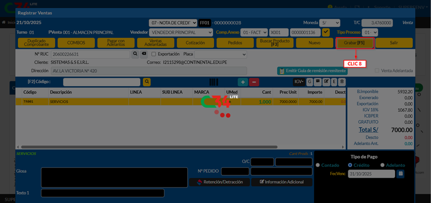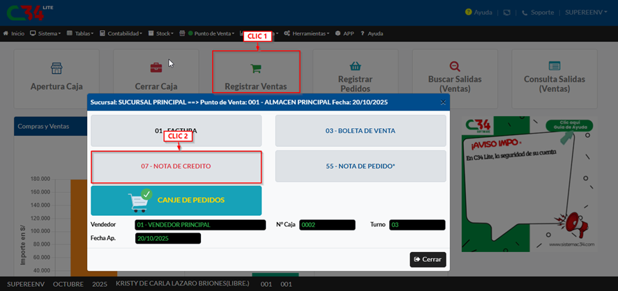 La nota de crédito Tipo 01 se registra desde el C34 LITE y desde ahí se realiza el envío, (CLIC 1) en Registrar Ventas, (CLIC 2) en Nota de Crédito