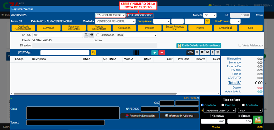 Seguido se observa la nota de crédito, la serie y numero del comprobante, de manera automática el correlativo del comprobante.