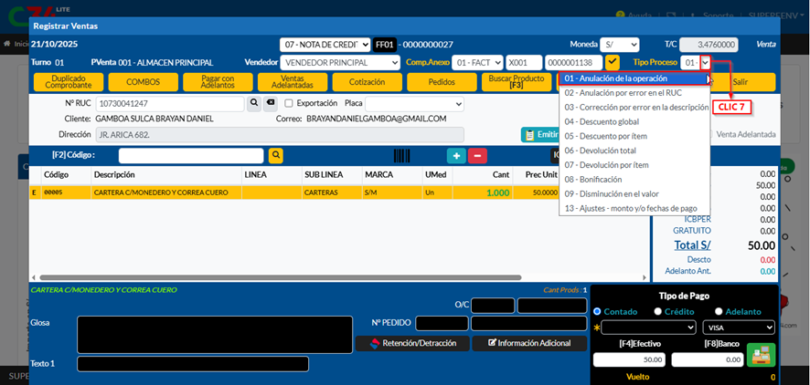 EMISIÓN DE NOTA DE CRÉDITO TIPO N° 01: ANULACIÓN DE LA OPERACIÓN