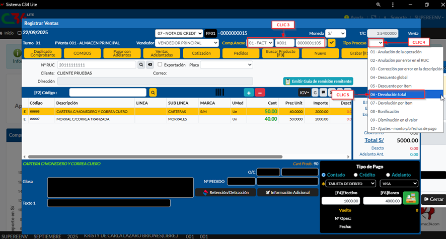 Nos saldrá una ventana emergente donde vamos a Comprobante Anexo (CLIC 3) seleccionamos una Factura o Boleta; seguidamente en Tipo de Proceso (CLIC 4), deslizar y seleccionamos 6.- Devolución Total (CLIC 5), verificamos que los datos que se muestran en la pantalla sean las mismas al comprobante anexado.